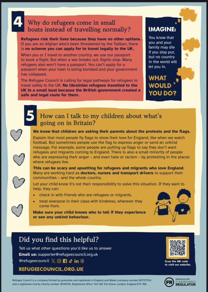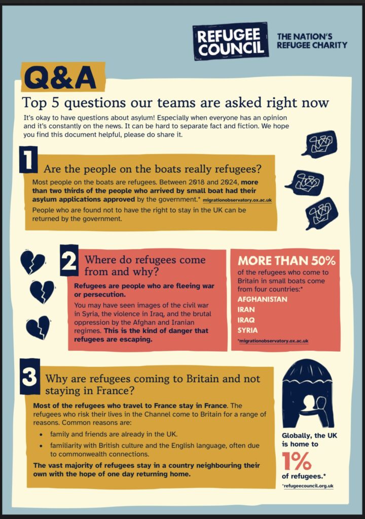 This is why clear, evidence-based information matters. Not because data alone changes hearts, but because truth offers a foundation for compassion, fairness and accountability. To support this, we’ve included a document produced by the Refugee Council – a respected national organisation with decades of frontline experience outlining five of the most common questions their teams hear from the public when it comes to people seeking asylum and refuge. These questions reveal something important: much of the fear circulating in the UK today comes from misinformation, not from lived reality.